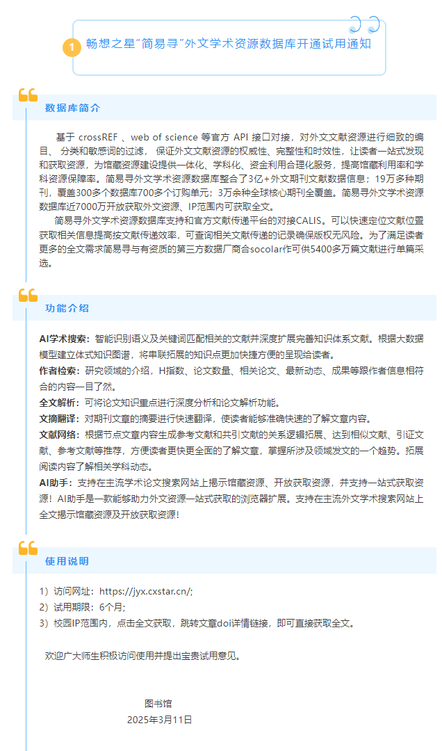 通知 | 畅想之星“简易寻”外文学术资源数据库开通试用