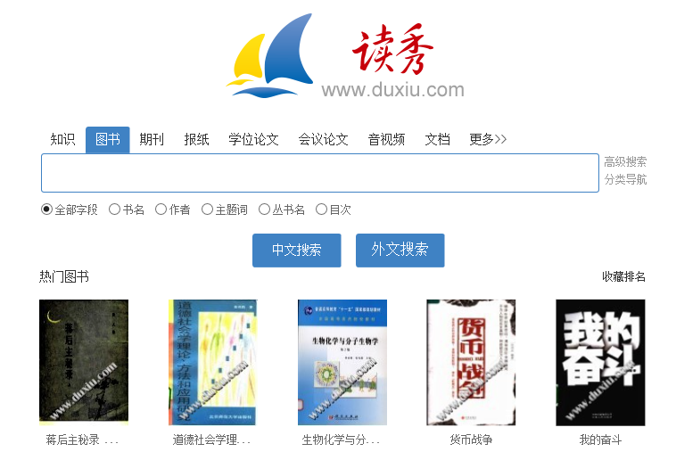 读秀学术搜索是一个海量的超大型数据库,它能够为读者提供240万种图书原文、10亿页全文资料等各种学术资源检索及使用。同时,通过读秀学术搜索,能一站式检索馆藏纸质图书、电子图书等各种数据库资源,几乎襄括了本单位文献服务机构内的所有信息源。不论是学习、研究、写论文、做课题、拓展阅读,读秀都能为读者提供最全面、准确的学术资料。